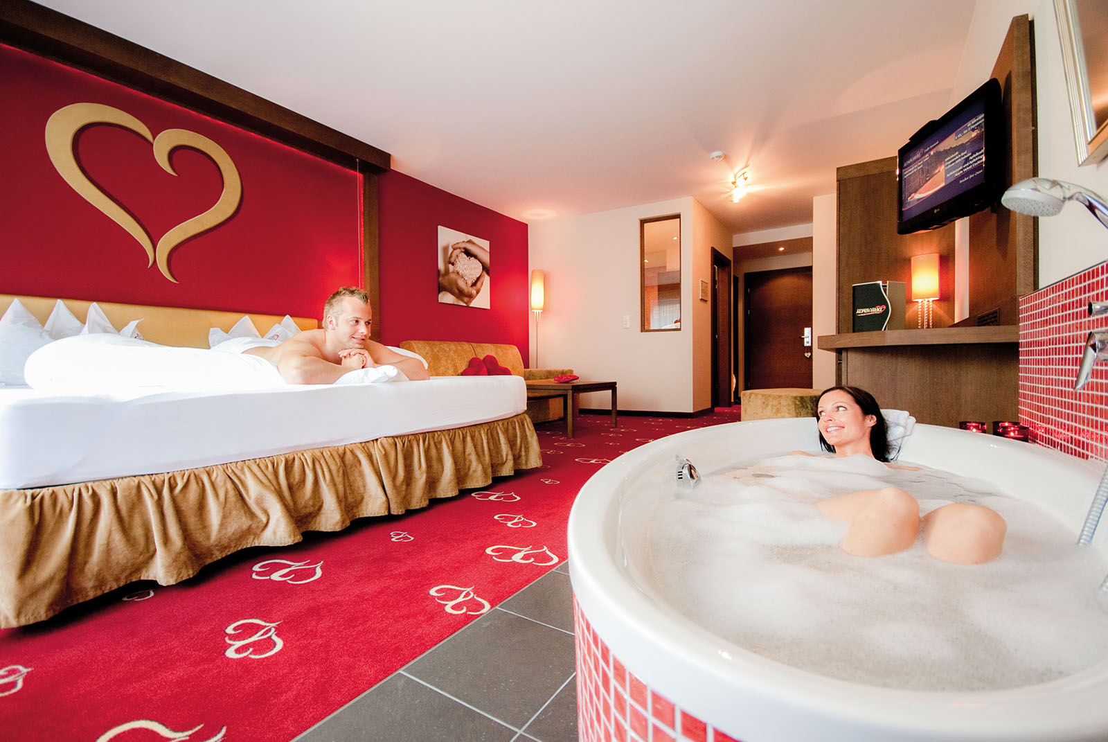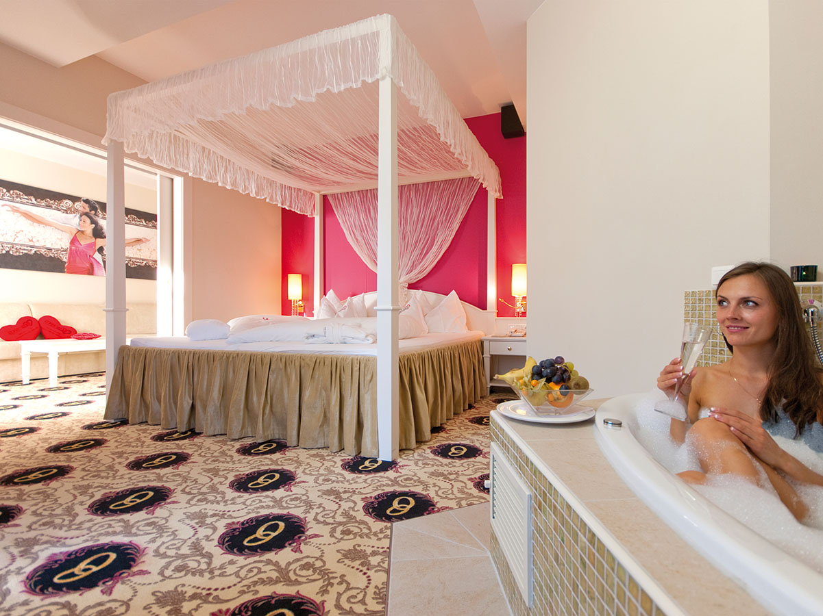 Neben der Saunawelt mit finnischer Sauna, Bio-Sauna und Dampfbad bietet das Liebeshotel eine große Auswahl an entspannenden Paarmassagen, Romantik-Bäder und Beauty-Anwendungen.